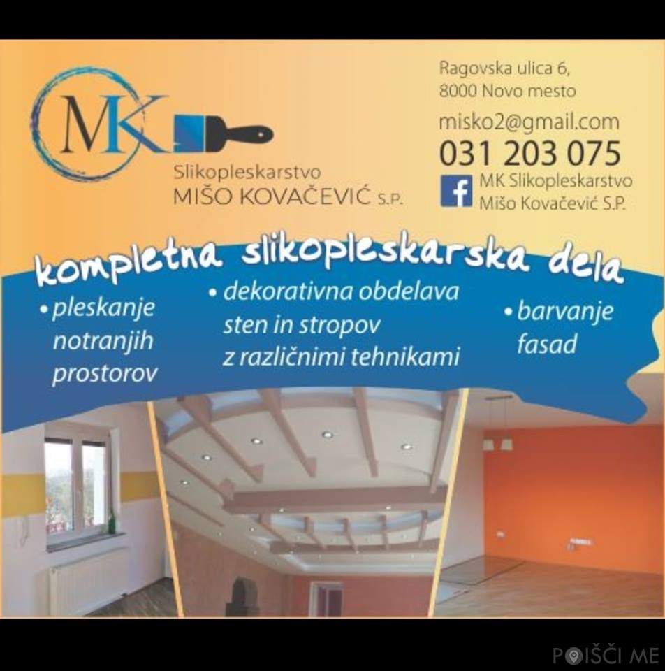 V podjetju MK SLIKOPLESKARSTVO, pleskarska dela, Mišo Kovačević s.p. Novo mesto vam že dolga leta nudimo storitve na področju slikopleskarstva, in sicer belimo stanovanjske, poslovne in industrijske objekte, pleskamo lesene in kovinske konstrukcije ter stavbno pohištvo.